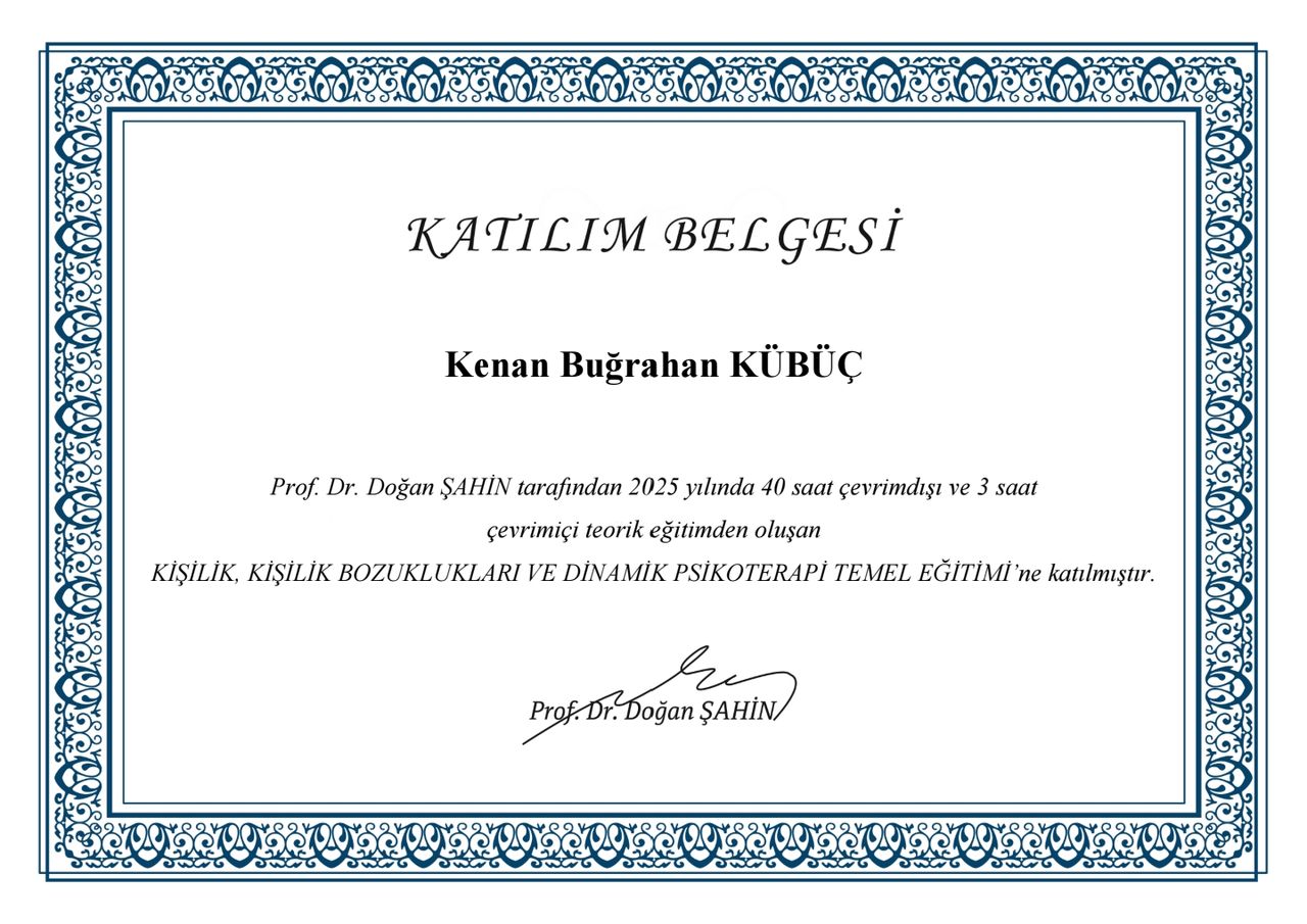 Psikolog Kenan Buğrahan Kübüç, tam burslu olarak öğrenim gördüğü Doğuş Üniversitesi İngilizce Psikoloji Bölümü'nden onur derecesi ile mezun olmuştur. Lisans bitirme projesini, derslerde verilen örneklerin öğrencilerin güncel yaşamlarında yer alan olgular gözetilerek seçilmesinin öğrenmeye etkisini inceleyen araştırma projesinde yer alarak tamamlamıştır. Bakırköy Prof. Dr. Mazhar Osman Ruh ve Sinir Hastalıkları hastanesi başta olmak üzere 3 yıl boyunca klinik psikoloji, endüstri-örgüt psikolojisi alt dallarında çeşitli kuruluşlarda staj görmüş ve aynı zamanda 'Panik bozukluk sahibi bireylere yönelik BDT temelli kendi kendine yardım uygulaması' projesinde ekip yönetmeni olarak görev almıştır. Şu anda Beykent Üniversitesi'nde Klinik Psikoloji alanında tam burslu olarak yüksek lisans öğrenimini sürdürmektedir.